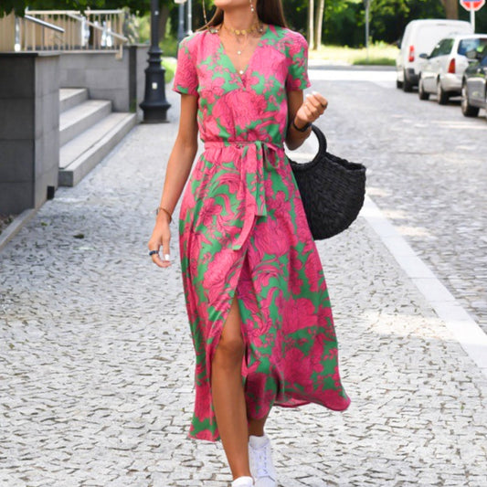 Naisten rento elegantti printtikuvioinen V-kaula-aukkoinen mekko