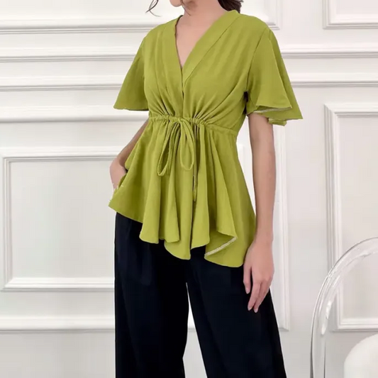 Naisten trendikäs V-pääntiöllinen paita, vyötärösidoksella ja lyhyillä hihoilla