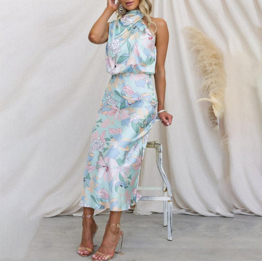 Kukkakuvioinen niskalenkillinen maksimekko joustavalla vyötäröllä
