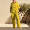 MUKAVA PUUVILLAN JA PELLAVAN SEKOITUS - Tämä korkealaatuisesta puuvillan ja pellavan sekoituksesta valmistettu kaksiosainen puku tarjoaa täydellisen tasapainon mukavuuden ja tyylin välillä. Kankaan luonnollinen hengittävyys takaa mukavuuden koko päiväksi, mikä tekee siitä ihanteellisen rennoille retkille tai kotona oleskeluun.