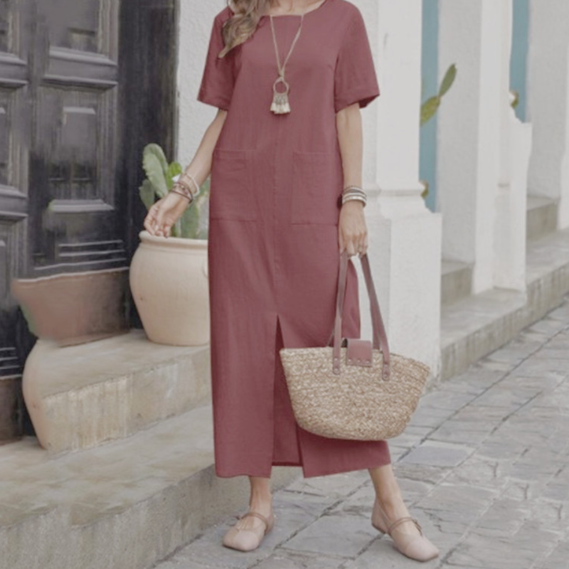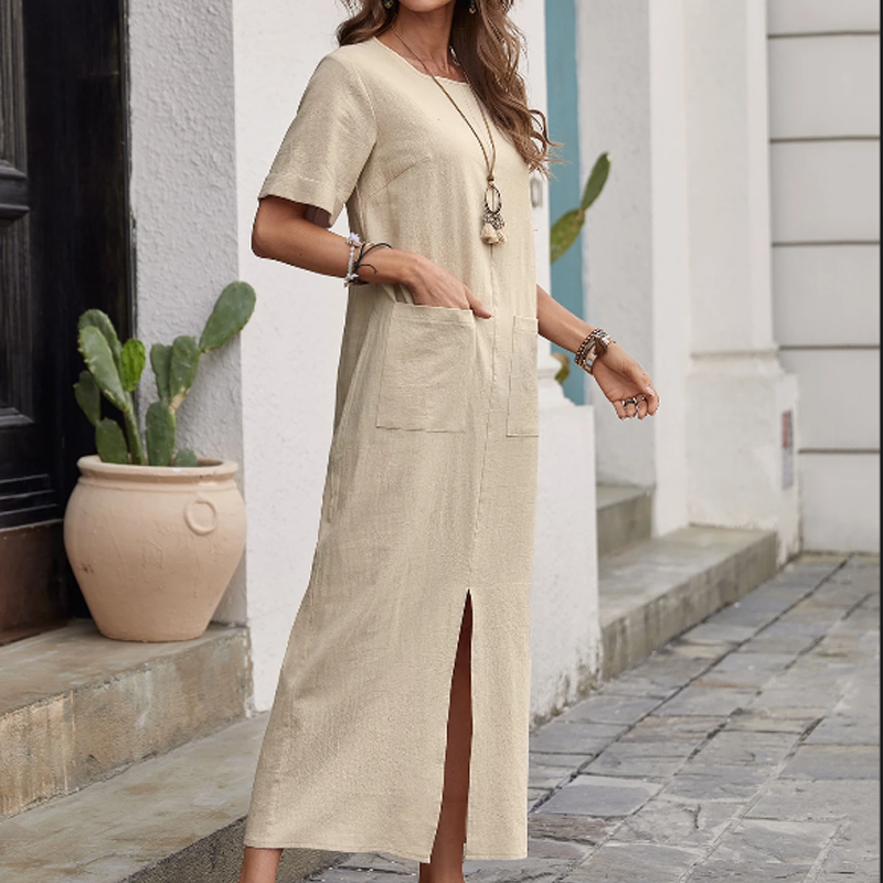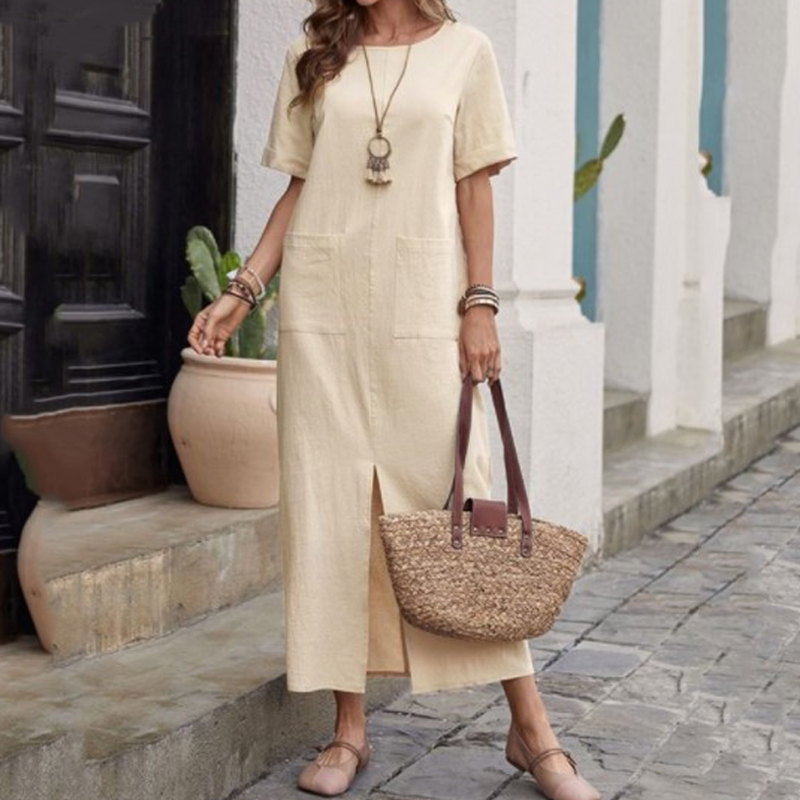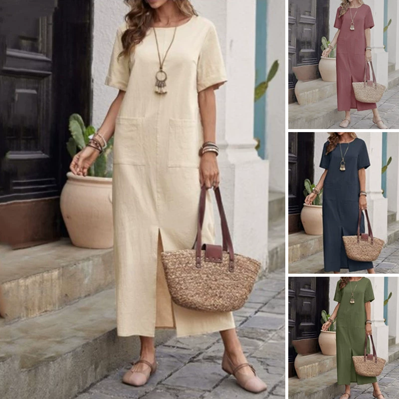 Pakkaus sisältää: 1 × Puuvilla-pellavainen löysä pyöreäkauluksinen mekko