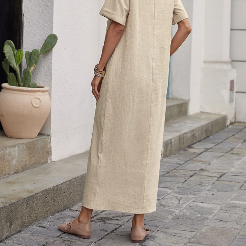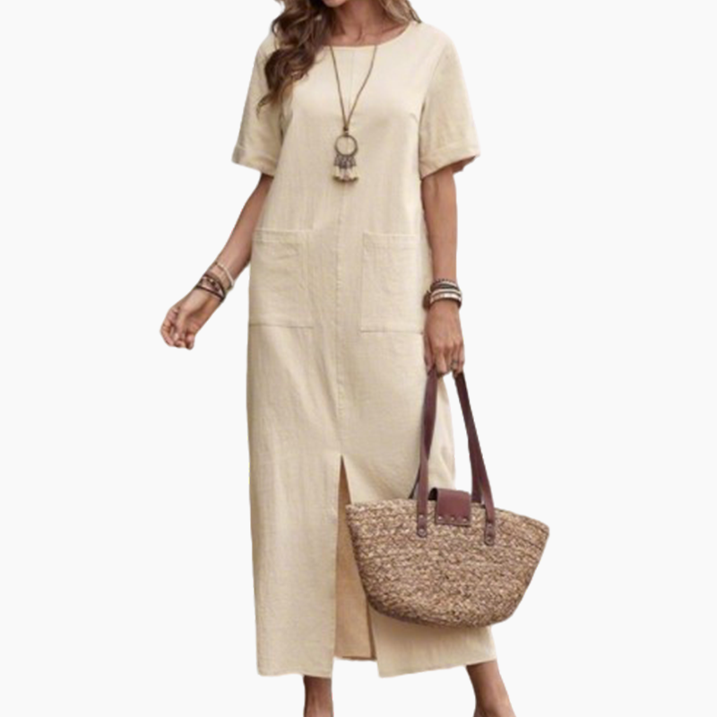 Puuvilla-pellavainen löysä pyöreäkauluksinen mekko