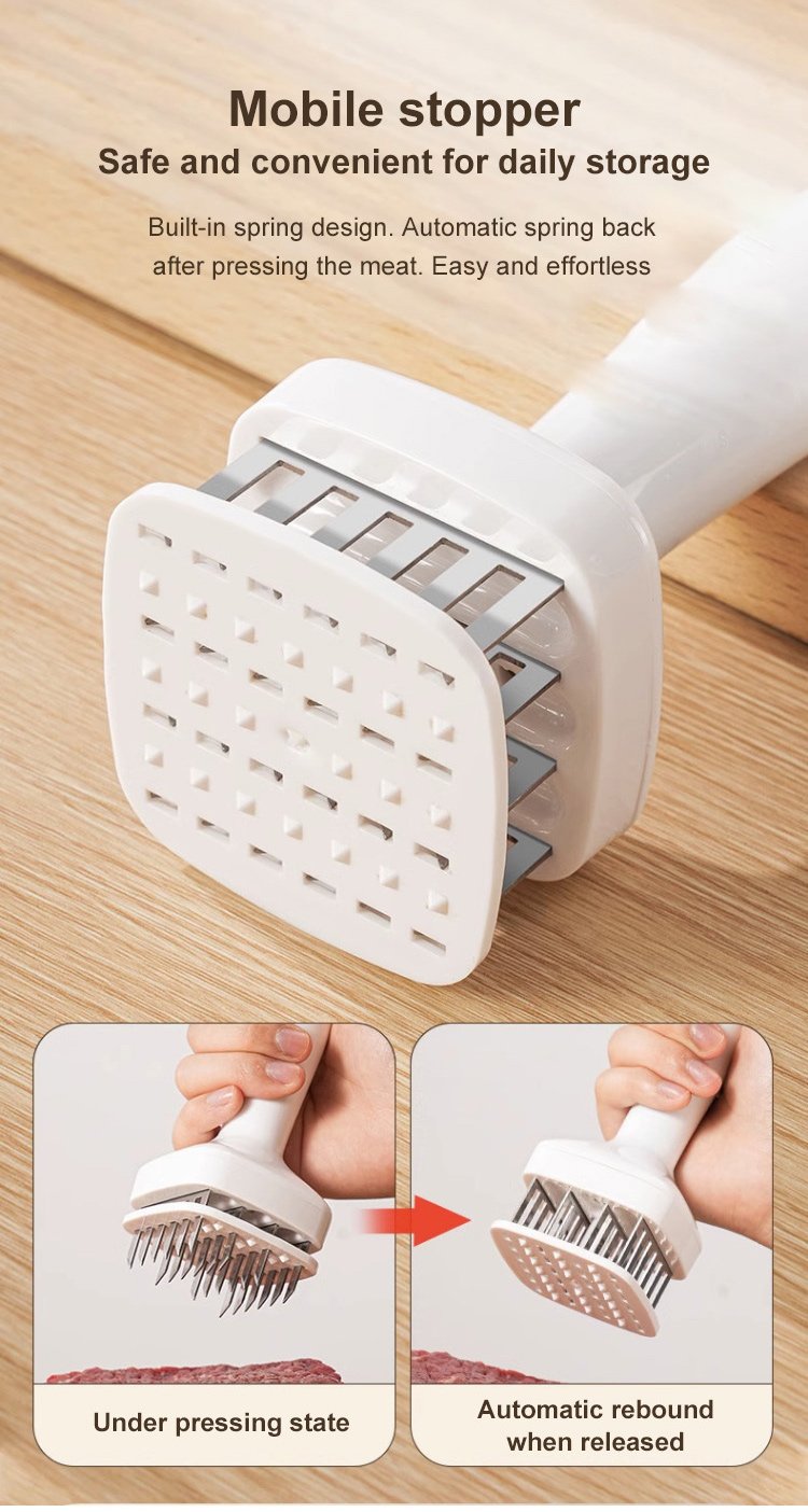Terät työntyvät ulos vain, kun niitä painetaan lihaa vasten, ja vetäytyvät automaattisesti. 100 % elintarvikekelpoista materiaalia, turvallinen mureuttamiseen, FDA-hyväksytty.