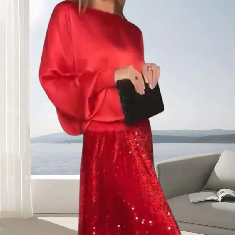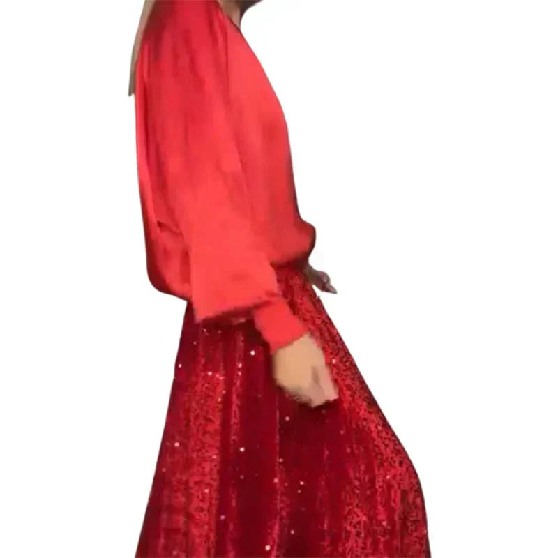 🎀Naisten Pitkähihainen Toppi ja Paljetteja Maksihame Kaksiosainen Setti✨