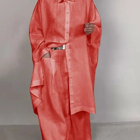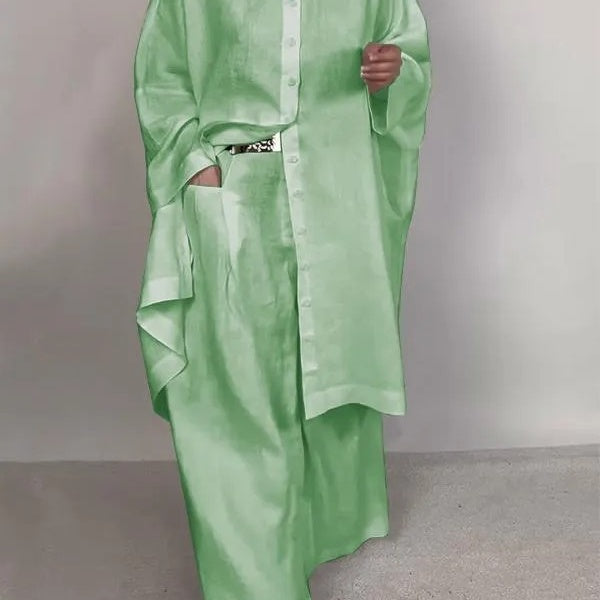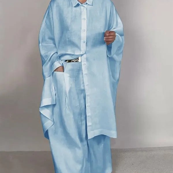 TÄYDELLINEN SETTI: Tämä setti sisältää napitettavan paidan ja leveälahkeiset housut, jotka yksinkertaistavat vaatekaappisi valintoja ja parantavat tyyliäsi vaivattomasti. Paita tarjoaa eleganssia, kun taas leveälahkeiset housut takaavat mukavuuden ja tyylin joka tilanteeseen.