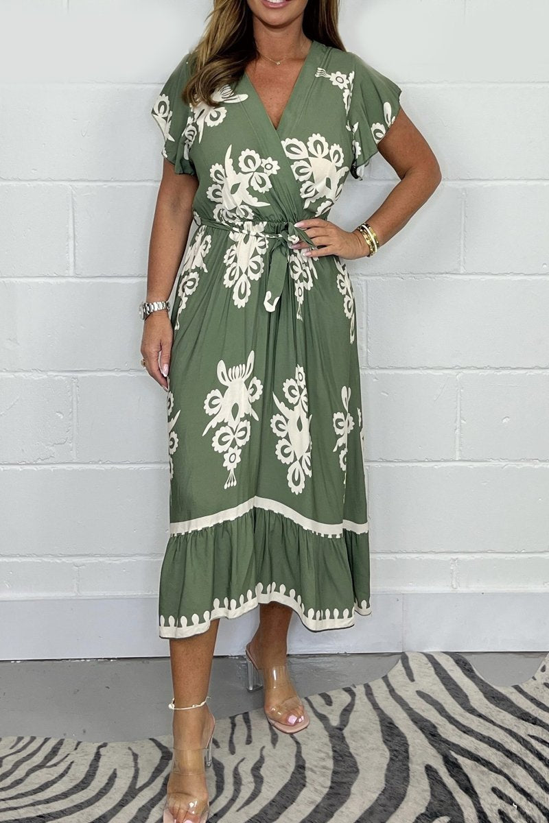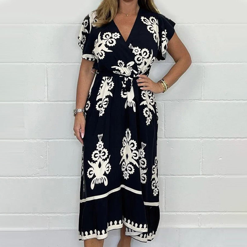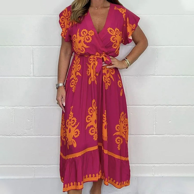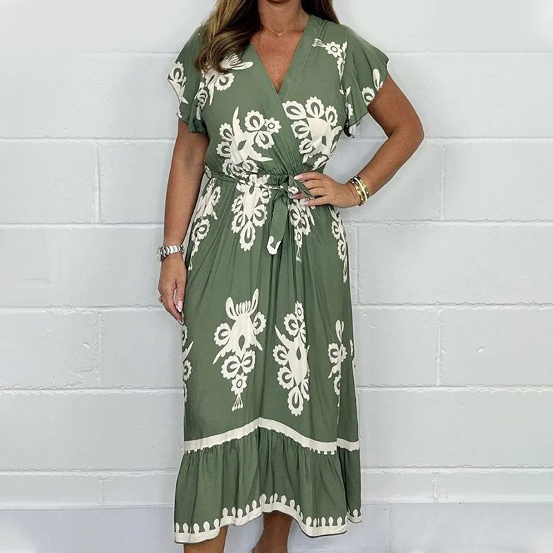 Kesäinen röyhelöhihainen V-kaula-aukkoinen mekko jossa solmio plus-kokoisille naisille
