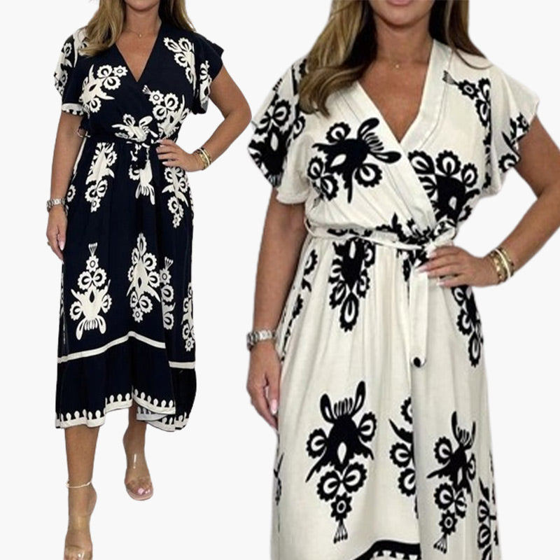 IMARTELEVA MUOTOILU: Tämä mekko esittelee imartelevan siluetin, V-kaula-aukkoinen ja lootuslehtimäisten hihojen kanssa, jotka lisäävät ripauksen eleganssia kesävaatekaappiisi.
