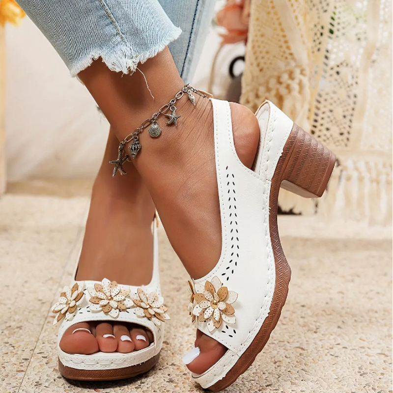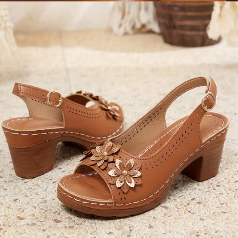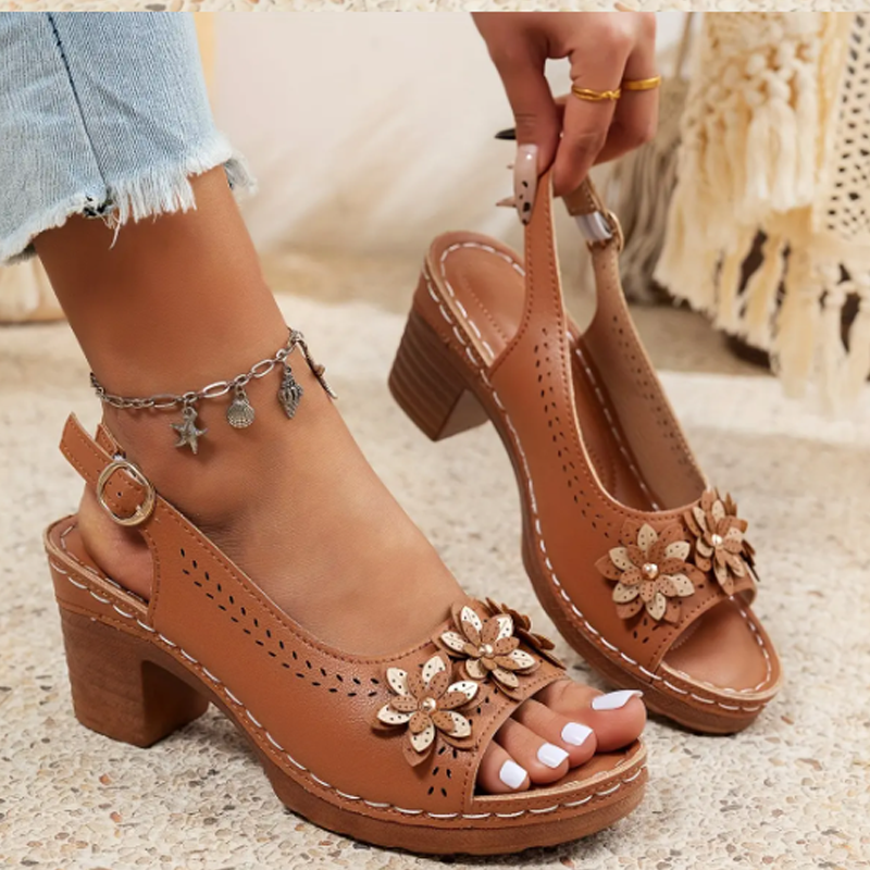 Pakkaus sisältää: 1 * Naisten elegantit sandaalit paksulla korolla ja kukkakoristeilla