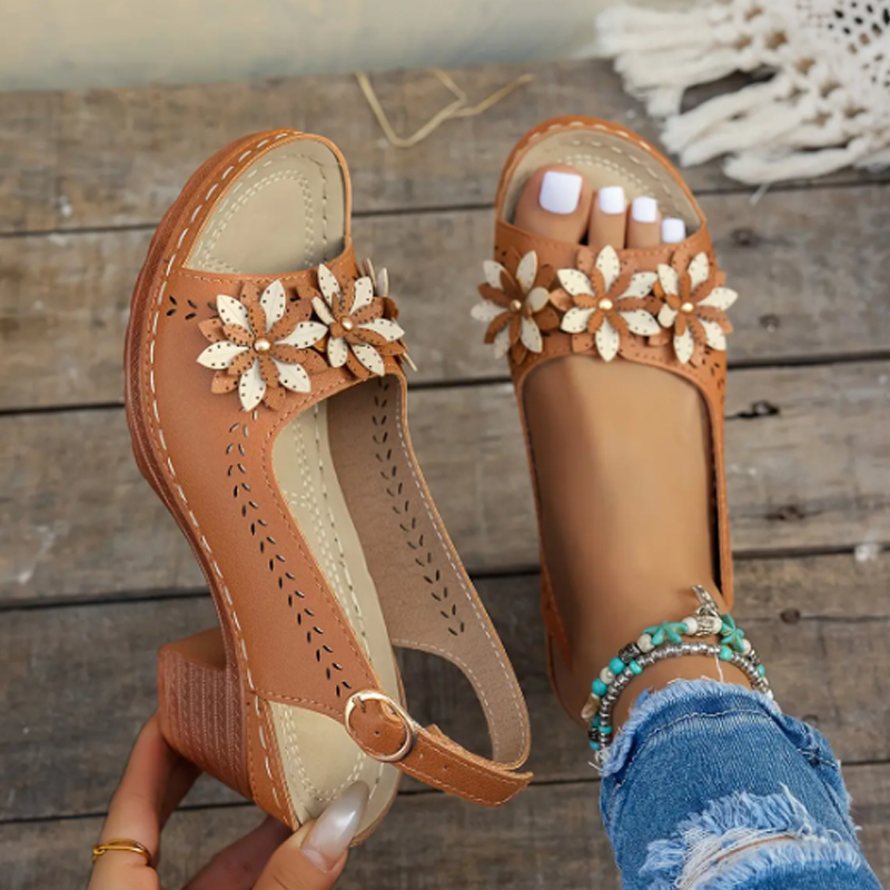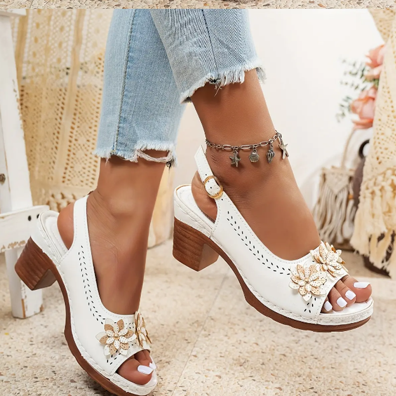 ELEGANTTI KUKKAMUOTOILU: Näissä sandaaleissa on kauniit kukkakoristeet, jotka tuovat asuun hienostuneisuutta ja viehättävyyttä – täydellinen valinta rentojen tai puolimuodollisten asujen viimeistelyyn.