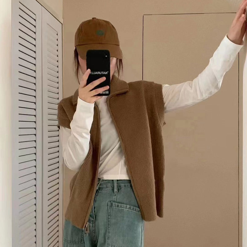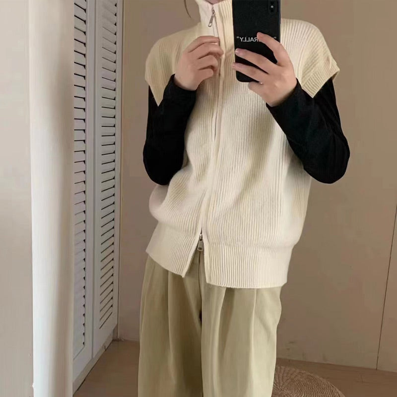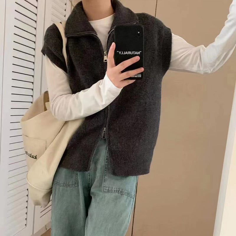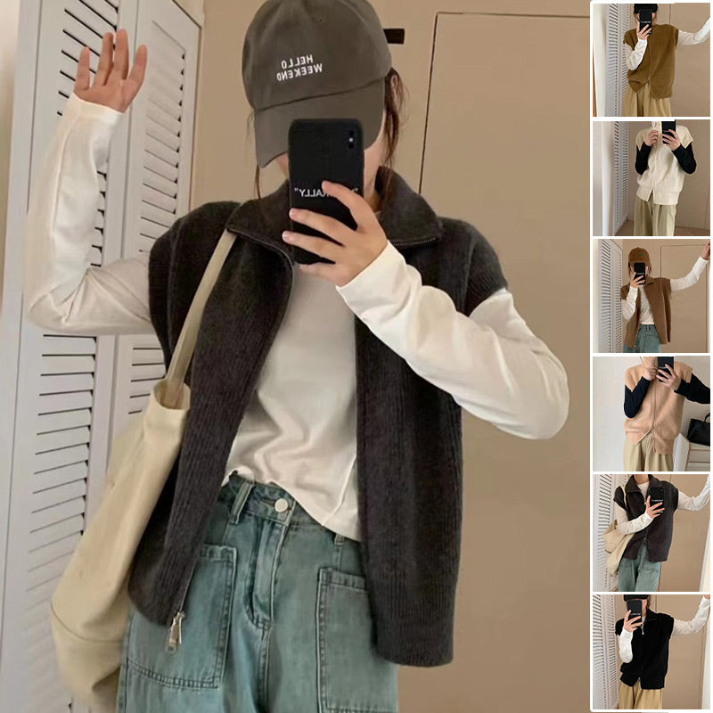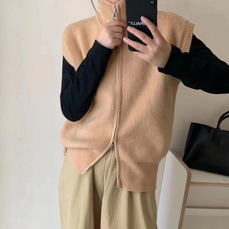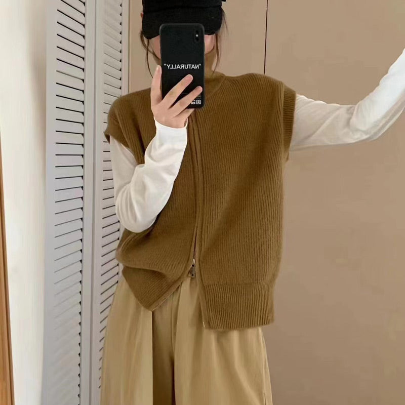 SLEEVELESS VEST DESIGN: This fashionable sleeveless vest features a classic solid color and a soft, textured fabric for timeless appeal. The zipper at the hem can be adjusted to create a trendy slit, enhancing its stylish look, perfect for early autumn.