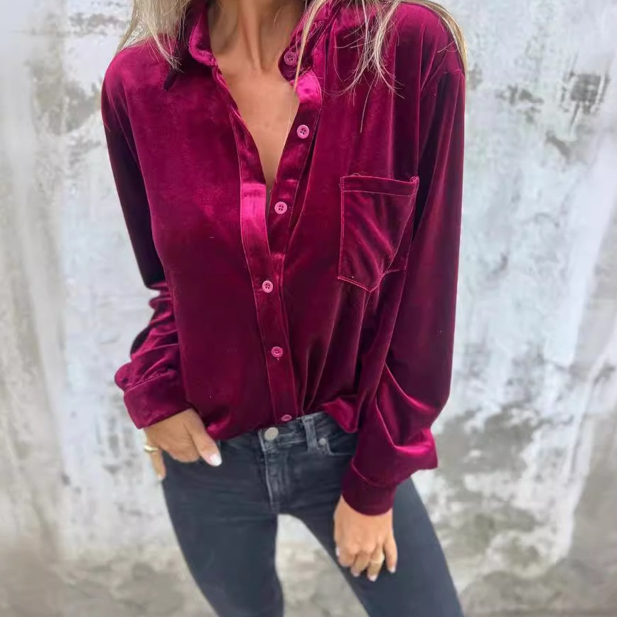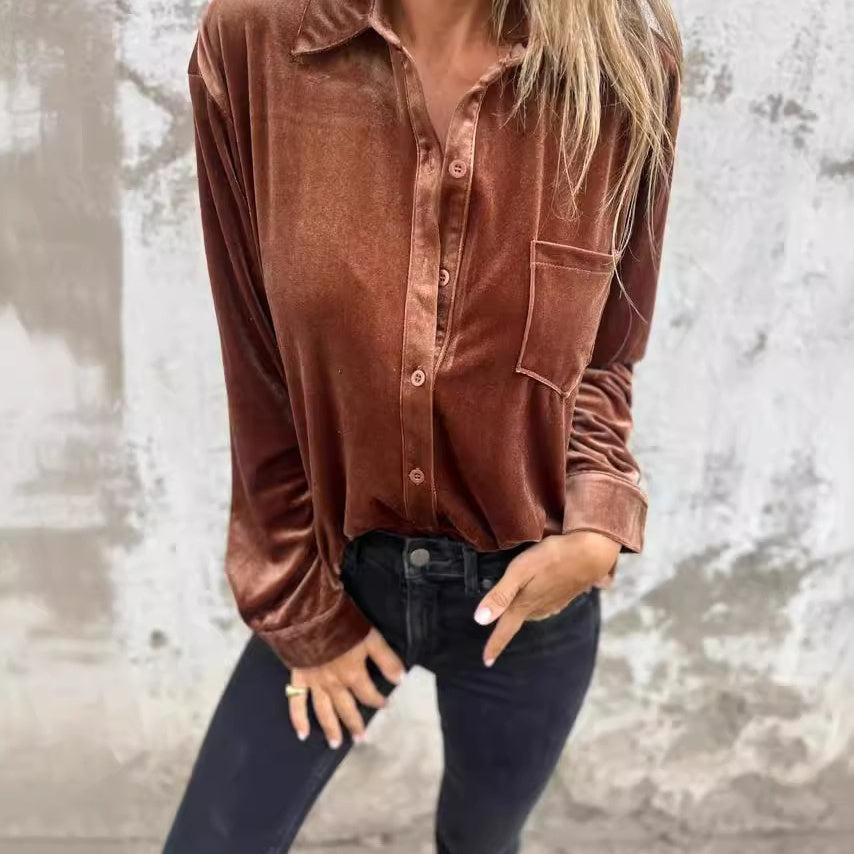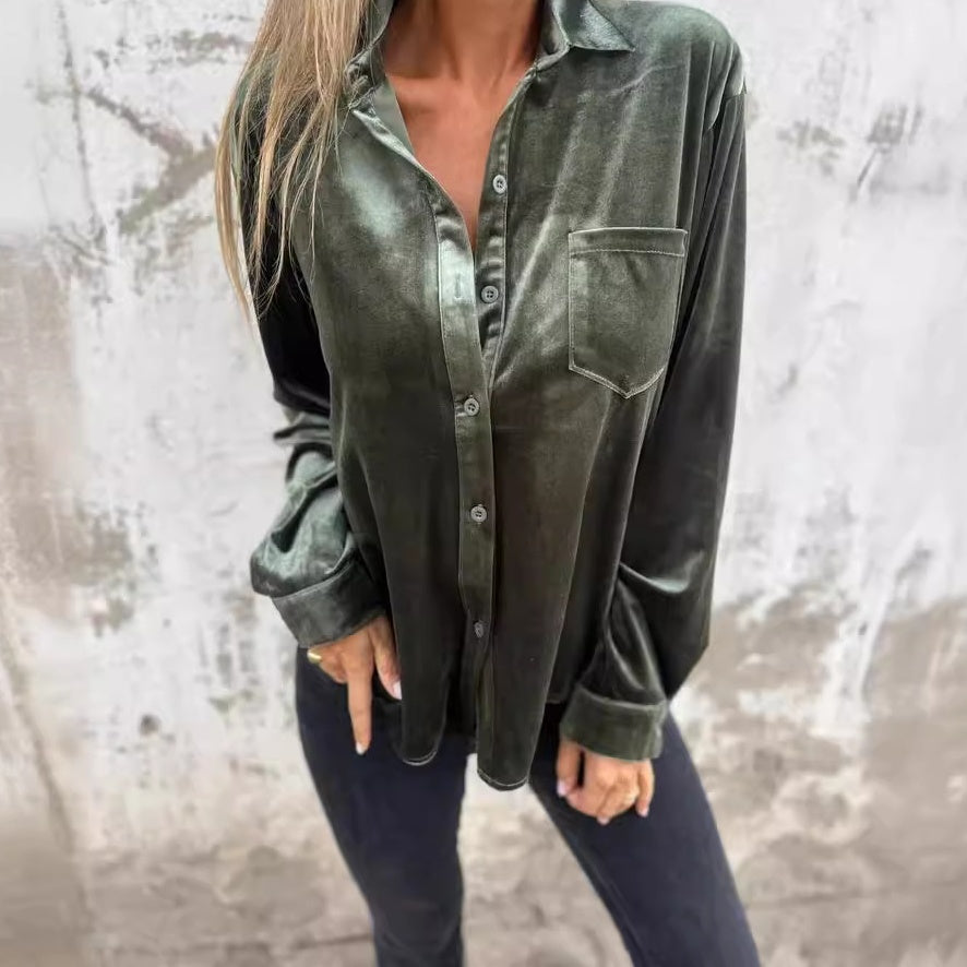 Naisten pitkähihainen nappipaita, jossa on tasku