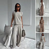 TÄYSI 2-OSAISTEN SETTI - Setti sisältää hihattoman T-paidan ja leveälahkeiset housut, jotka tarjoavat tyylikkään ja helposti päällepuettavan asun, joka yksinkertaistaa vaatevalintojasi mihin tahansa tilaisuuteen.