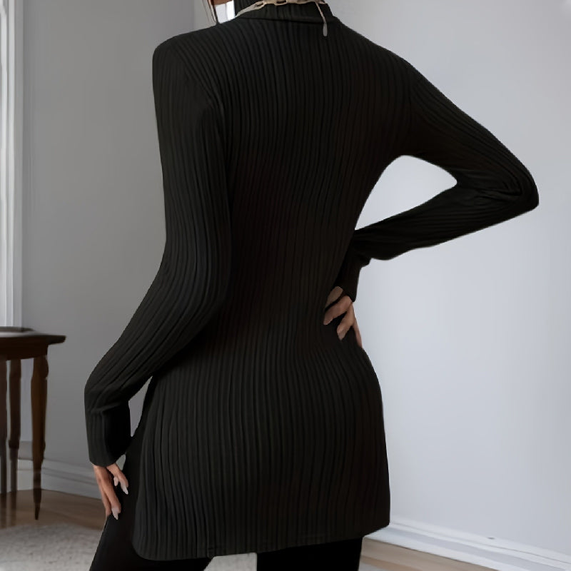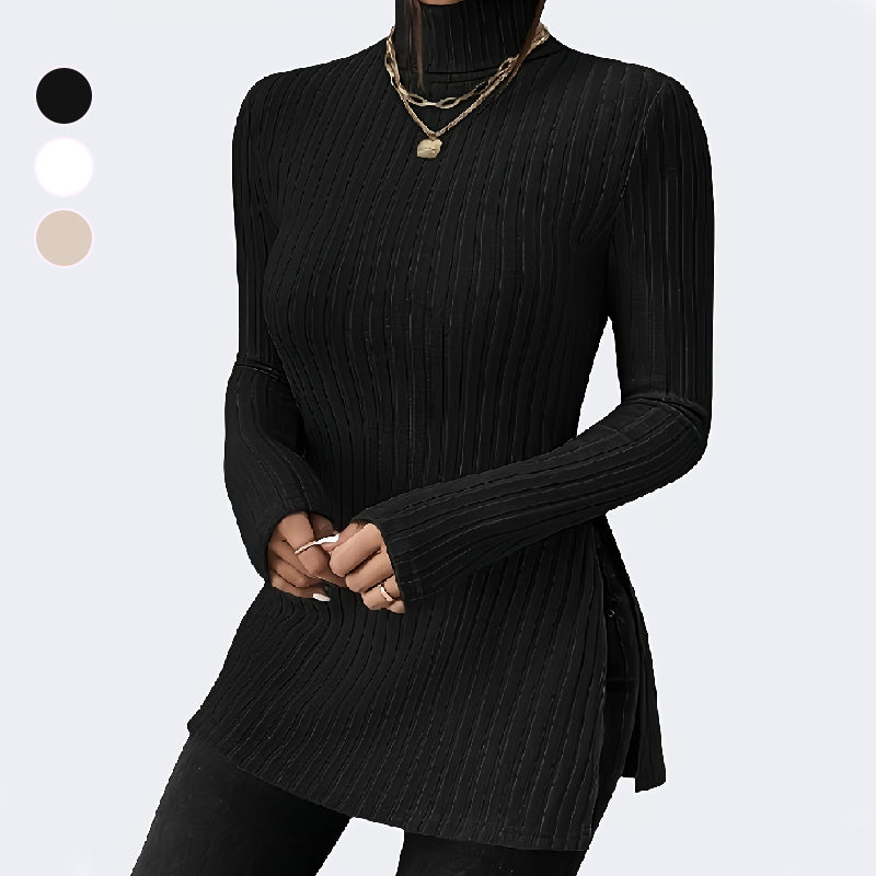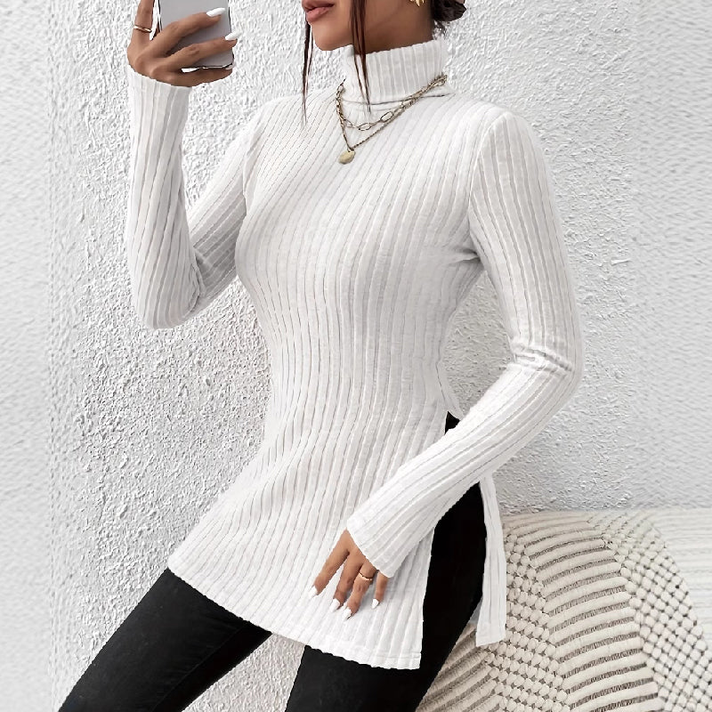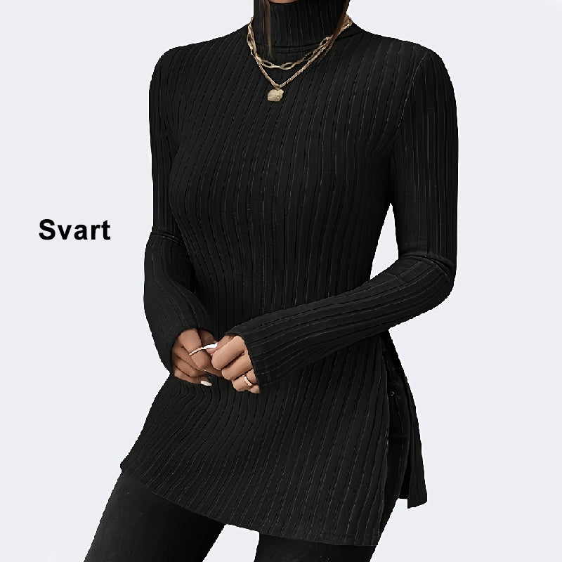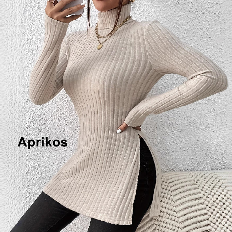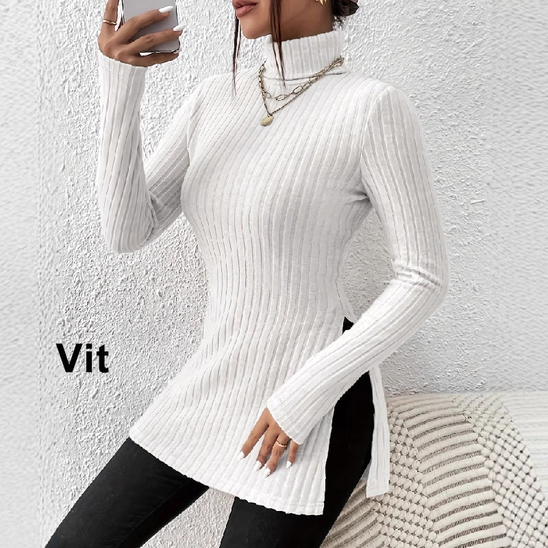 Naisten venyvä korkeakauluksinen neule jossa on pienet halkiot